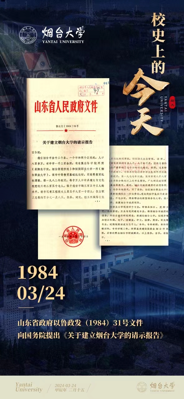 【編者按】2024年是新中國(guó)成立75周年,也是煙臺(tái)大學(xué)建校40周年。40年來,誕生于改革開放時(shí)代大潮中的煙臺(tái)大學(xué),扎根齊魯文化沃土,傳承北大清華基因,弘揚(yáng)改革開放精神,勇?lián)逃龔?qiáng)國(guó)使命,書寫了一段段滋蘭樹蕙的育人故事,譜寫了一曲曲乘風(fēng)破浪的奮進(jìn)贊歌。為慶祝煙臺(tái)大學(xué)建校四十周年,新聞中心(融媒體中心)即日起推出“校史上的今天”欄目,以時(shí)間為線索,擷取煙大建校發(fā)展史上具有代表意義的重大事件,重溫閃耀在歷史長(zhǎng)河中的昔年今朝,追憶在鹽堿灘上白手起家、艱苦創(chuàng)業(yè)的崢嶸歲月,展現(xiàn)辦學(xué)歷程中取得的新發(fā)展成就,啟迪新時(shí)代煙大人在新征程中再創(chuàng)新輝煌。