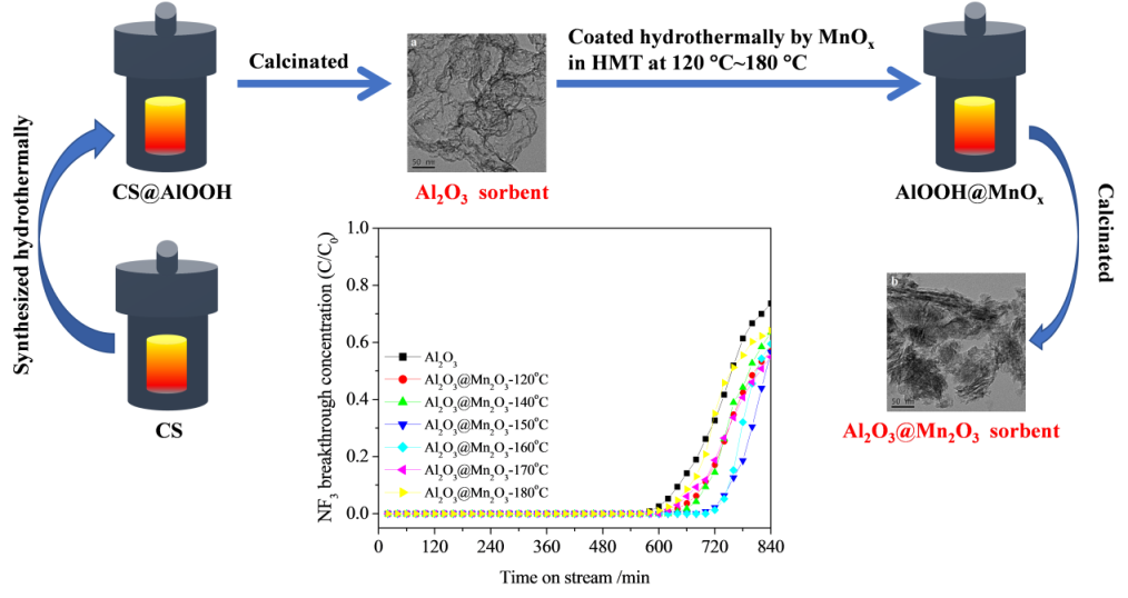 在前期工作(Journal of Environmental Chemical Engineering, 2019, 7, 103192;2020, 8, 103890;2020, 8, 104166)基礎上,近日徐秀峰教授團隊合成了薄片形貌Al2O3@Mn2O3復合固氟劑,用于分解NF3,顯著加快了NF3氣體的擴散與反應,提高了固氟劑活性和利用率。研究結果以“Destructive sorptionofNF3as a novel greenhouse gasoverAl2O3@Mn2O3sorbentswith high surface area”為題,發表在Process Safety and Environmental Protection。有關工作為制備高活性高利用率NF3分解固氟劑提供了有益的啟示。