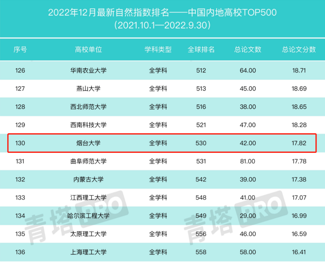 近日,自然指數官網更新了2022年最新的自然指數排名(統計時間節點為2021年10月1日至2022年9月30日),煙臺大學位居內地高校第130位,全球學術排名530位。