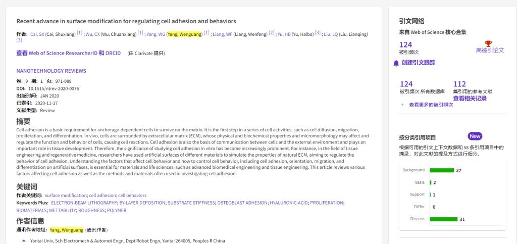 根據Essential Science Indicators(簡稱ESI)2023年1月公布的最新統計結果,煙臺大學機電汽車工程學院教師楊文廣發表于《NANOTECHNOLOGY REVIEWS》的論文《Recent advance in surface modification for regulating cell adhesion and behaviors》入選ESI高被引論文。該論文以煙臺大學為第一署名單位,楊文廣副教授為唯一通訊作者。