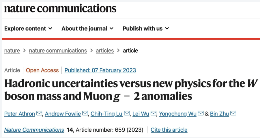 2023年2月7日,煙臺大學物理與電子信息學院祝斌副教授同南京師范大學武雷教授團隊(PeterAthron、Andrew Flowie、盧致廷、武雷、吳永成)在電弱精確測量擬合與新物理研究中取得重要研究進展。研究成果以“Hadronic Uncertainties versus New Physics for the W boson Mass and Muon g-2 Anomalies”為題發表《Nature Communication(自然.通訊)》(Nature Communications 14 (2023) 659)。按照高能物理的慣例,論文署名以字母順序排名,祝斌副教授為共同通訊作者。