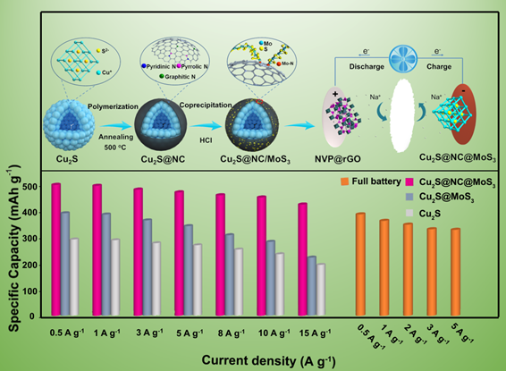 近日,煙臺大學環境與材料工程學院的姜付義教授與周艷麗副教授團隊,在國際知名期刊Small上發表題為“Design of High-Capacity MoS3Decorated Nitrogen Doped Carbon Coated Cu2S Electrode Structures with Dual Heterogenous Interfaces for Outstanding Sodium-Ion Storage”的文章(影響因子:15.153)。該工作采用高容量MoS3和高電導率的氮摻雜碳共同修飾Cu2S空心納米球,成功制備出了分級Cu2S@NC@MoS3異質結構。其中,氮摻雜碳層作為鏈接有利于MoS3的均勻沉積,增加了結構穩定性和電導率。受歡迎的空心/多孔結構很大程度上抑制了活性材料的體積變化。得益于三組分的協同效應,具有雙界面和低電壓極化的Cu2S@NC@MoS3異質結構展示出十分優異的儲鈉性能。除了性能測試,反應機理、動力學分析以及理論計算也被用來解釋該異質結構性能優異的原因。此外,與Na3V2(PO4)3@rGO正極組裝成的全電池同樣展示出優異的電化學性能。