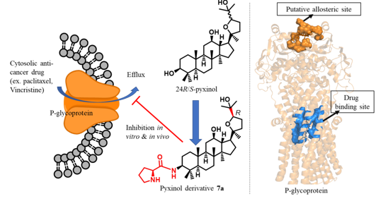 本團隊以人參皂苷在人肝臟中的主要活性代謝產物——pyxinol為母核結構基礎,以化學生物學和藥物分子設計合成為主要研究方向,針對腫瘤多藥耐藥的P-糖蛋白靶點,構建了系列高活性抑制劑,并利用P-糖蛋白N端的潛在變構位點進行虛擬篩選,然后在蛋白分子水平、細胞水平及動物進行了確證。該研究將有力引導并推動P-糖蛋白非底物型變構抑制劑的研究與開發,為新型腫瘤多藥耐藥逆轉劑的發現,提供了一種全新的策略。
