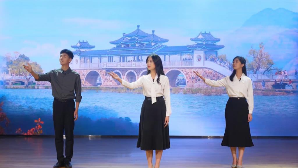 備賽環節有許多流程,都需要團隊協作分工去完成,團隊也是在這一點一滴中凝聚力量、培養默契。王智弘提到,他們團隊會根據“男重女輕”來統籌,男生來負責場地道具,服裝搬運等體力活,女生負責制作PPT,具體對接攝像、場地燈光等任務。團隊通常采用會一人為主,兩人為輔的方式,實現基礎分工、通力協作。而多人合誦最大的考驗是團隊每個人之間的默契,作品的呈現程度與觀眾的觀感都是由彼此的默契直接體現。為了克服這個問題,團隊先是確定通篇基調,把彼此間前后銜接的節奏控制好;其次在日常練習中,習慣于無配樂的干音練習,使問題暴露的更徹底,也加強“三足鼎立”的架勢,而不是單一的各自演繹,這種形式在完善團隊默契度的同時,也更好增加了文稿的藝術呈現。通過三位成員的精雕細琢和密切配合,著力還原了詩人兼具中國古典文學與外國現代文學的融會貫通,努力構建了現實情境和想象情境的交差融合,力求達到含蓄雋永、意味深長、韻律優美的藝術效果。