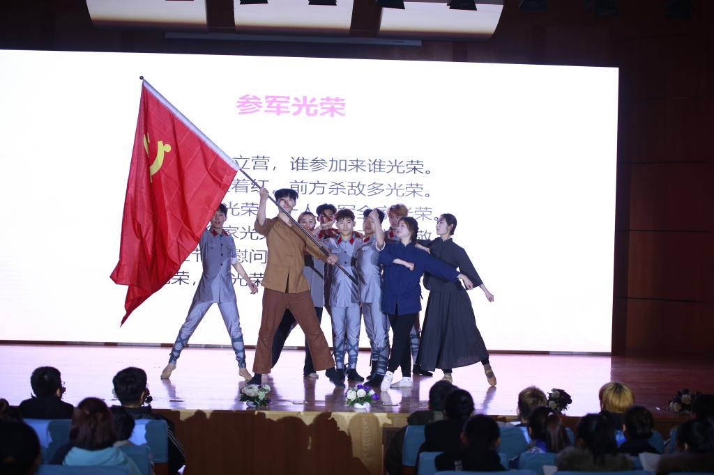 傳唱會分為“膠東抗戰,英雄輩出”“軍民一心,參軍擁軍 ”“文化掃盲,婦女解放”三個篇章。傳唱會中,主創人張超老師深情講述了她調研過程中的感人故事,并與學生一起通過采訪錄音、混聲合唱、小合唱、舞蹈、情景再現等多種形式,傾情演繹了16首反映膠東抗戰歷史的歌曲。《海陽的鐵西瓜》《女英雄陳桂香》《戰斗英雄任常倫》等合唱歌曲頌揚了膠東英雄兒女,飽含著對黨和祖國的深深熱愛;《參軍光榮》《送子參軍》等歌舞作品生動再現了戰爭年代英雄兒女們“自信初心潔,肝膽始無前”的革命意志。一首首膾炙人口的歌謠,一段段感人至深的故事,讓現場觀眾心潮澎湃、熱血沸騰。
