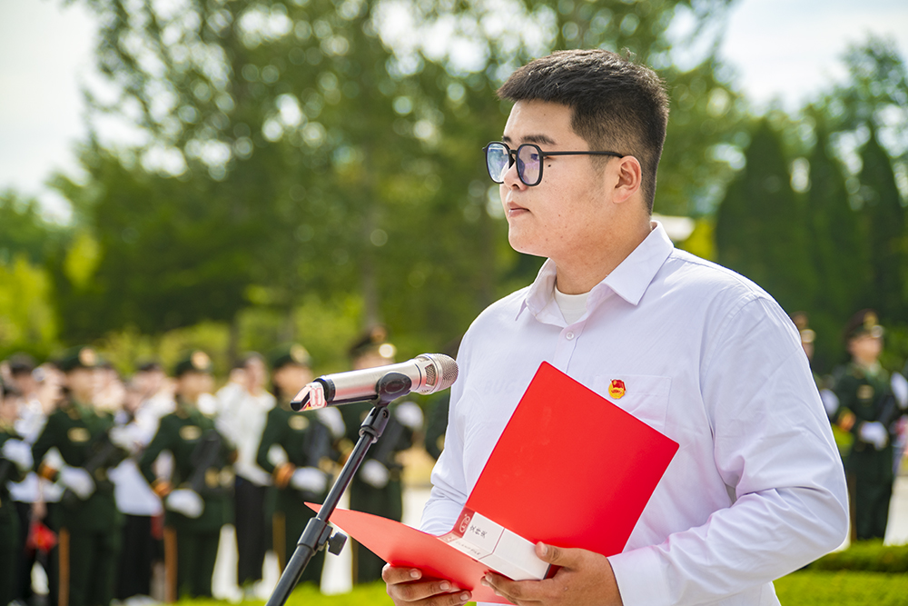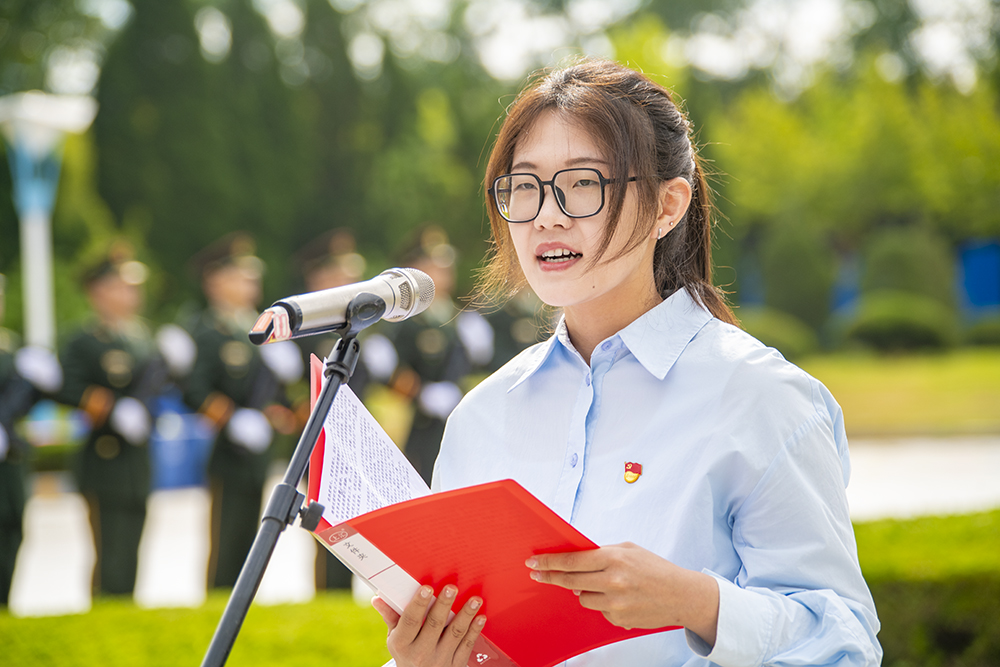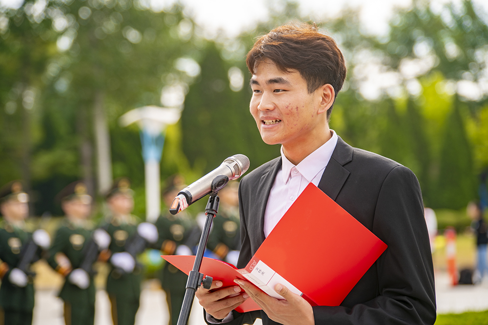 “我以青春的名義,莊嚴宣誓:熱愛我的祖國,緊跟黨的步伐,做祖國母親忠實的擁護者,堅持‘守信、求實、好學、力行的校訓……”學生代表、化學化工學院2020級高分子材料與工程專業馬曉宇同學帶領現場學生代表在鮮艷的五星紅旗下莊嚴宣誓。