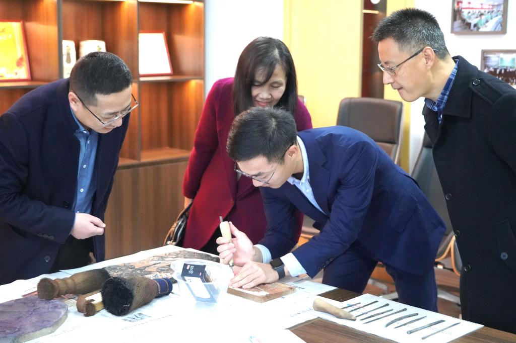 與會人員前往學院非遺體驗工作坊,體驗東昌府木版年畫制作方法。