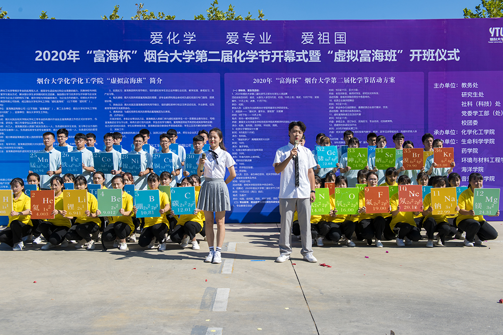 煙臺大學化學節(jié)由教務(wù)處、研究生處、社科(科技)處、黨委學工部(處)、校團委主辦,化學化工學院承辦,生命科學學院、藥學院、環(huán)境與材料科學學院、海洋學院、音樂舞蹈學院協(xié)辦,今年已是第二屆。在化學節(jié)開幕式上,校黨委書記張偉、校長郭善利、富海集團郭元山共同用化學顯色反應(yīng)的方式為本屆化學節(jié)揭幕,充分展現(xiàn)化學的神奇之處。隨后,舉行了煙臺大學化學化工學院“虛擬富海班”開辦儀式。校長郭善利老師先后為富海集團郭元山先生和富海集團朱相濱先生、化院專業(yè)教師翁永根老師和化院團委陳俊羲老師頒發(fā)“煙臺大學大學生就業(yè)導(dǎo)師”聘書及“‘虛擬富海班’導(dǎo)師”聘書。