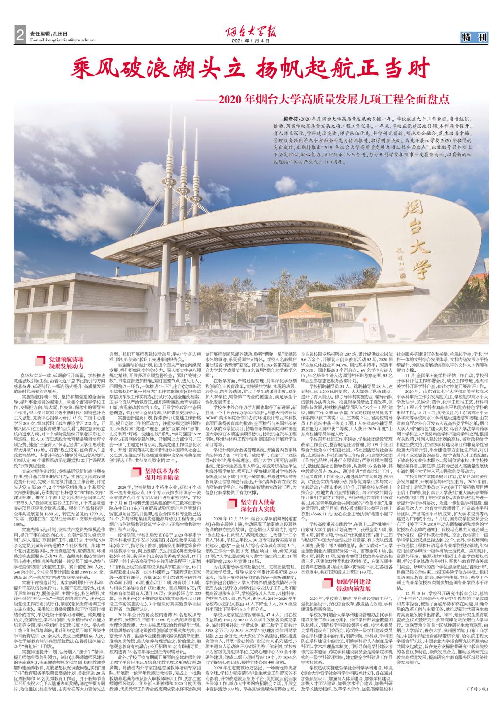 編者按:2020年是煙臺(tái)大學(xué)高質(zhì)量發(fā)展的關(guān)鍵一年。學(xué)校成立九個(gè)工作專班,負(fù)責(zé)組織、推動(dòng)、落實(shí)學(xué)校高質(zhì)量發(fā)展九項(xiàng)工程工作任務(wù)。一年來(lái),學(xué)校在黨建思政引領(lǐng)、本科質(zhì)量提升、育人體系深化、學(xué)科建設(shè)突破、師資隊(duì)伍優(yōu)先、科學(xué)研究創(chuàng)新、校地校企融合、民生改善幸福、管理服務(wù)強(qiáng)化等九個(gè)方面全面發(fā)力協(xié)調(diào)推進(jìn),取得明顯成效。為充分展示學(xué)校2020年取得的突出成績(jī),近日特推出“2020年煙臺(tái)大學(xué)高質(zhì)量發(fā)展九項(xiàng)工程全面盤點(diǎn)”,以激勵(lì)號(hào)召全校上下堅(jiān)定信心、凝心聚力、深化改革、加壓奮進(jìn),努力開(kāi)創(chuàng)學(xué)校各項(xiàng)事業(yè)發(fā)展新局面,以嶄新的面貌迎接中國(guó)共產(chǎn)黨成立100周年。