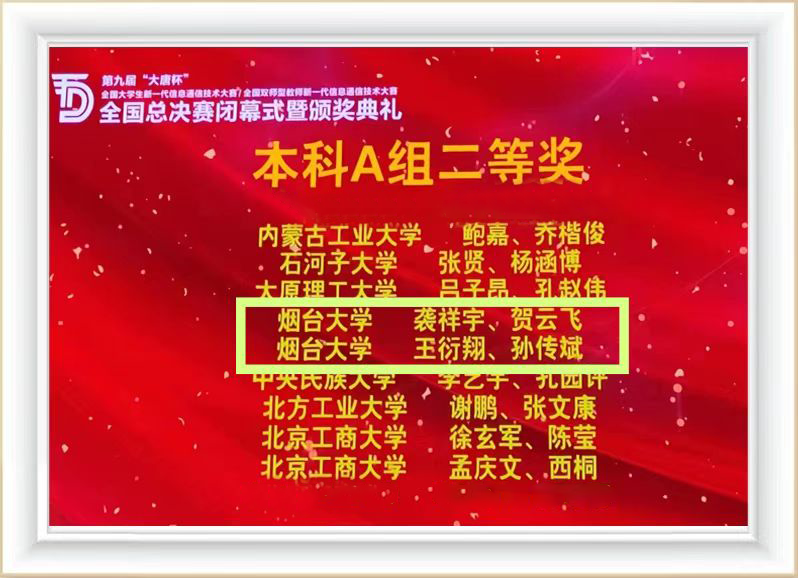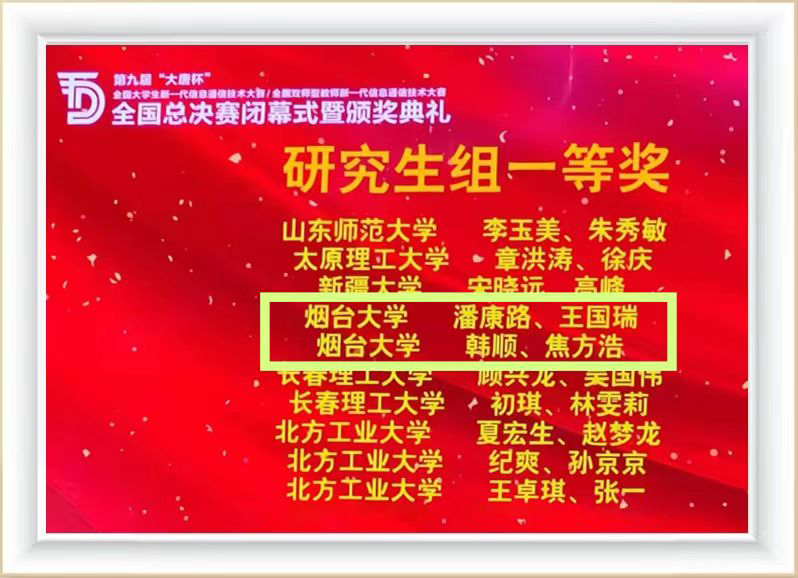 【本站訊】近日,第九屆“大唐杯”全國大學生新一代信息通信技術大賽(原全國大學生移動通信5G技術大賽)全國總決賽獲獎名單揭曉。煙臺大學再創佳績,獲得國家級一等獎2項、二等獎8項、三等獎17項,學生獲獎數目位居全國高校前列。其中,來自物理與電子信息學院電子科學與技術專業研究生潘康路和王國瑞、電子信息專業研究生韓順與焦方浩獲得國家一等獎。在大賽首次設置的“雙師型”教師賽道比賽中,來自物理與電子信息學院的張煒和賀鵬飛老師也分別榮獲該賽道組的國家級二等獎和三等獎。同時,學校獲得本次大賽的優秀組織協同獎。