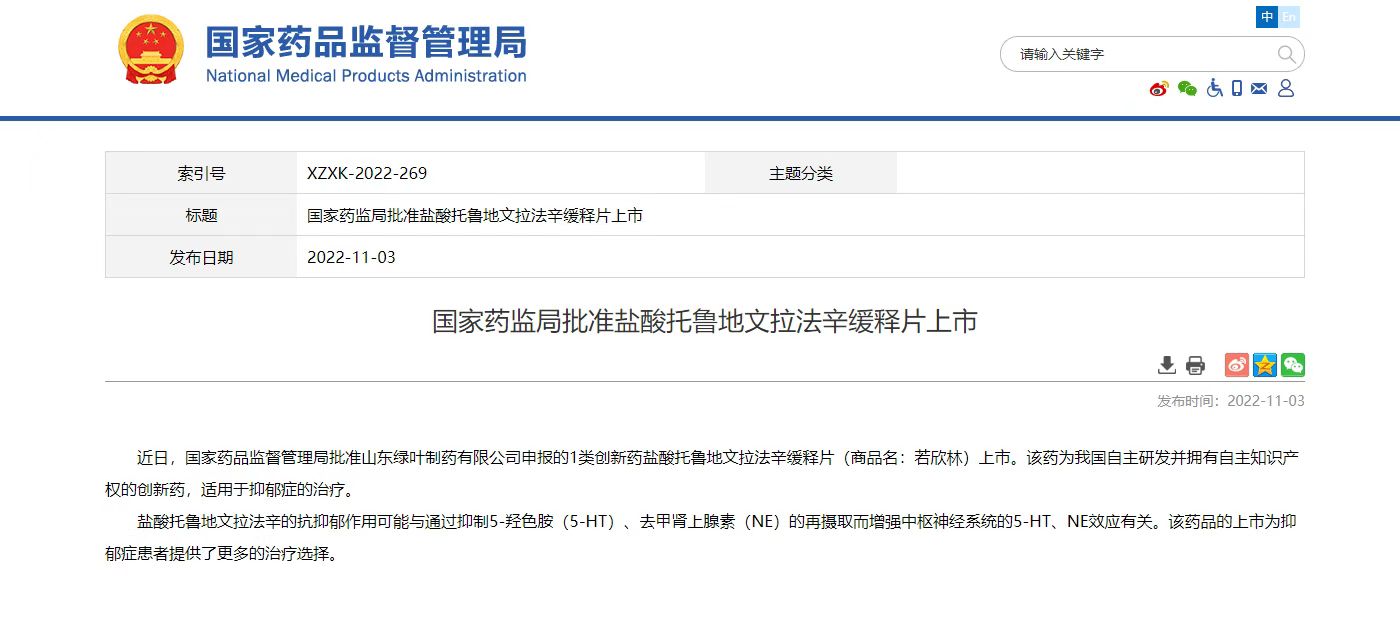 分子藥理和藥物評價教育部重點實驗室科研團隊主持研發的國家1類創新藥——鹽酸托魯地文拉法辛緩釋片獲國家藥品監督管理局批準上市