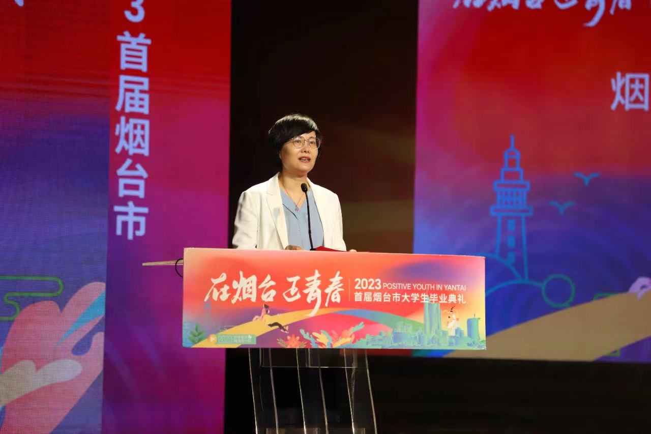 馮素玲代表駐煙高校向學子們送出畢業寄語。她表示,同學們的大學時光經歷了中華人民共和國成立70周年、中國共產黨成立100周年、中國共產主義青年團成立100周年、黨的二十大勝利召開等重要時間節點,你們將是實現第二個百年奮斗目標、建設社會主義現代化強國的生力軍,責任重大、使命光榮。她寄語畢業生們,要用實際行動賦予青春以信仰、以理想,在煙臺這座孕育了膠東革命精神的城市接續奮斗,在嶄新的人生征程中用拼搏奮斗書寫新的精彩,以勤耕篤行贏取新的輝煌。