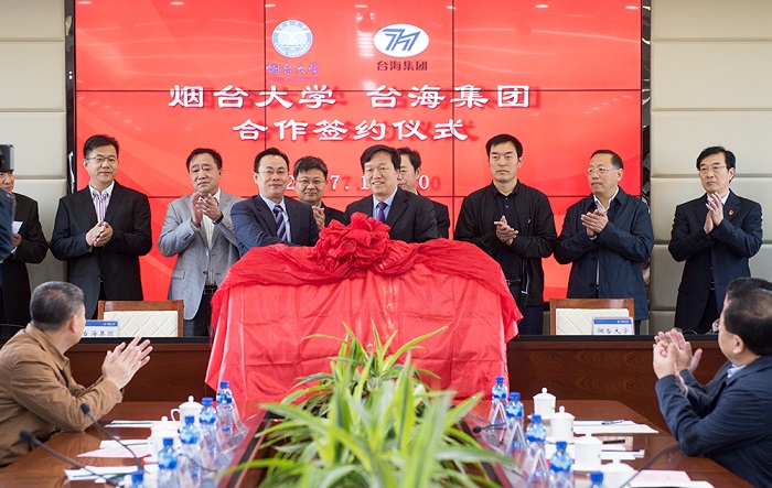 煙臺(tái)市臺(tái)海集團(tuán)有限公司總裁趙博鴻與煙臺(tái)大學(xué)校長郭善利代表雙方簽訂了合作協(xié)議,雙方將共同組建煙臺(tái)大學(xué)核裝備與核工程學(xué)院、臺(tái)海集團(tuán)煙臺(tái)大學(xué)核裝備與核工程技術(shù)研究院。金志海、包信勇、王雪欣、張偉共同為學(xué)院和研究院揭牌。