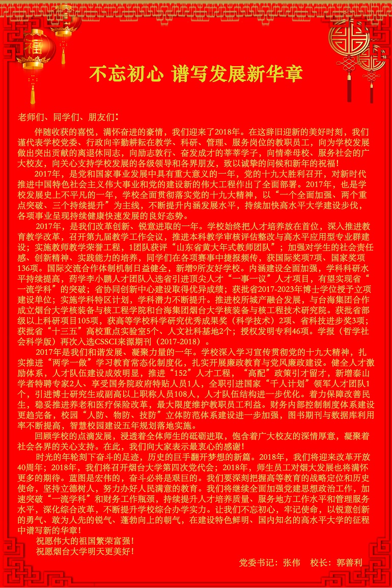 黨委書記張偉 校長郭善利發表新年賀詞