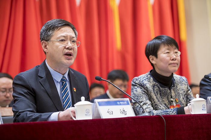 白皓代表省委教育工委和省教育廳黨組,向大會(huì)的召開(kāi)表示熱烈的祝賀,向?yàn)閷W(xué)校改革發(fā)展付出辛勤勞動(dòng)、做出積極貢獻(xiàn)的師生員工致以誠(chéng)摯的問(wèn)候。白皓對(duì)中共煙臺(tái)大學(xué)第三次代表大會(huì)召開(kāi)以來(lái),學(xué)校發(fā)展取得的成績(jī)給予充分肯定。白皓指出,當(dāng)前煙臺(tái)大學(xué)正處在全面實(shí)施“十三五”規(guī)劃、全面深化綜合改革、全面推進(jìn)高水平大學(xué)建設(shè)的關(guān)鍵時(shí)期。開(kāi)好這次黨代會(huì),對(duì)于學(xué)校開(kāi)啟高水平大學(xué)新征程、開(kāi)創(chuàng)學(xué)校黨建思想政治工作新局面具有十分重要的意義。要提高政治站位,加強(qiáng)黨的領(lǐng)導(dǎo),為事業(yè)又好又快發(fā)展提供堅(jiān)強(qiáng)保證;要堅(jiān)持立德樹(shù)人,強(qiáng)化使命擔(dān)當(dāng),深入貫徹全國(guó)全省高校思政會(huì)精神;要把握歷史機(jī)遇,堅(jiān)定奮斗目標(biāo),持續(xù)推進(jìn)學(xué)校各項(xiàng)事業(yè)改革創(chuàng)新。白皓希望即將選舉產(chǎn)生的煙臺(tái)大學(xué)新一屆黨委班子,高舉中國(guó)特色社會(huì)主義偉大旗幟,深入學(xué)習(xí)貫徹習(xí)近平新時(shí)代中國(guó)特色社會(huì)主義思想,全面貫徹落實(shí)黨的十九大精神,團(tuán)結(jié)帶領(lǐng)全校黨員干部和廣大師生員工,堅(jiān)持新發(fā)展理念,思想再解放、改革再深入、工作再抓實(shí),加快高水平大學(xué)建設(shè)步伐。