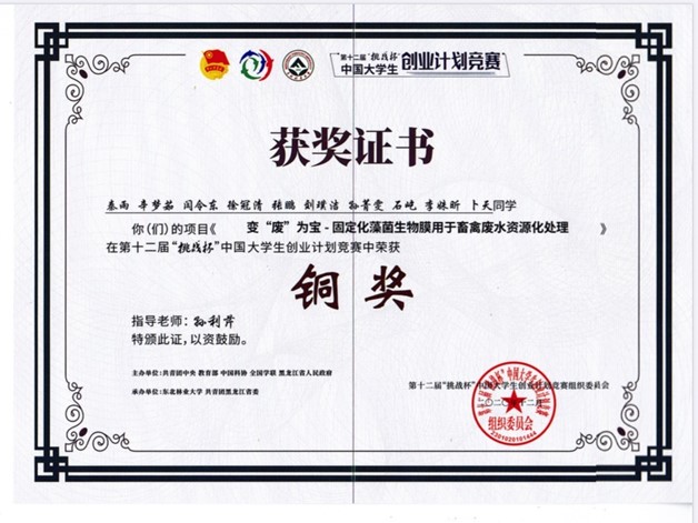 學院《變“廢”為寶-固定化藻菌生物膜用于畜禽廢水資源化處理》項目獲得第十二屆挑戰杯競賽銅獎