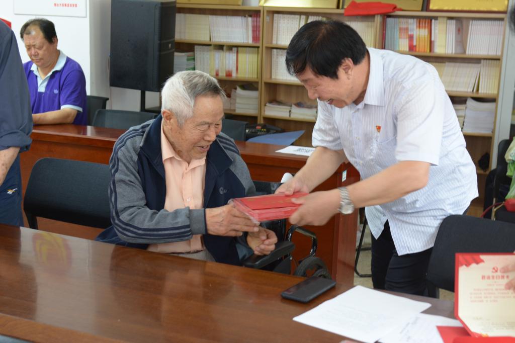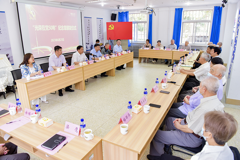 6月25日上午,煙臺大學在離退休黨群服務中心舉行“光榮在黨50年”紀念章頒發儀式。黨委書記張殿臣為參加本次活動的10位老黨員逐一佩戴“光榮在黨50年”紀念章,黨委常委、副校長王強和黨委常委、組織部部長王澤光為參會老黨員頒發“政治生日”賀卡,贈送具有紀念意義的“政治生日”禮物。滿滿的“儀式感”,進一步激發了老黨員的榮譽感、歸屬感和責任感,進一步強化了老黨員的身份意識和宗旨意識。