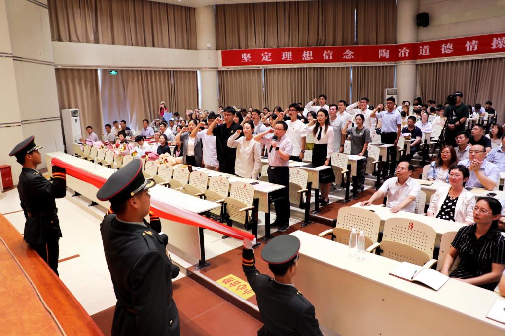 “我志愿加入煙臺大學,成為一名光榮的人民教師!我宣誓:愛國守法,敬業愛生,教書育人,知行合一……牢記使命,不忘初心,做黨和人民滿意的好老師,為崇高的教育事業而努力奮斗!”在學校青年創新人才協會理事長、生命科學學院王緒敏教授領誓下,學校新入職教師佩戴煙大“孺子牛”徽章,面向國旗許下錚錚誓言。