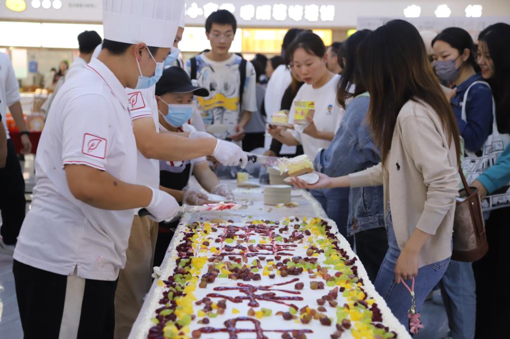 在第一餐廳,同樣的熱鬧也在上演。長達五米的蛋糕立在餐廳正中央醒目處,引得過往學子紛紛駐足,而右側橙黃色調的簽名墻更是深受大家喜愛。“我們選取‘水面泛舟’這樣一個意象作為簽名墻的背景底紋,希望同學們在無涯的學海中能夠堅定目標,激流勇進!”工作人員介紹道。