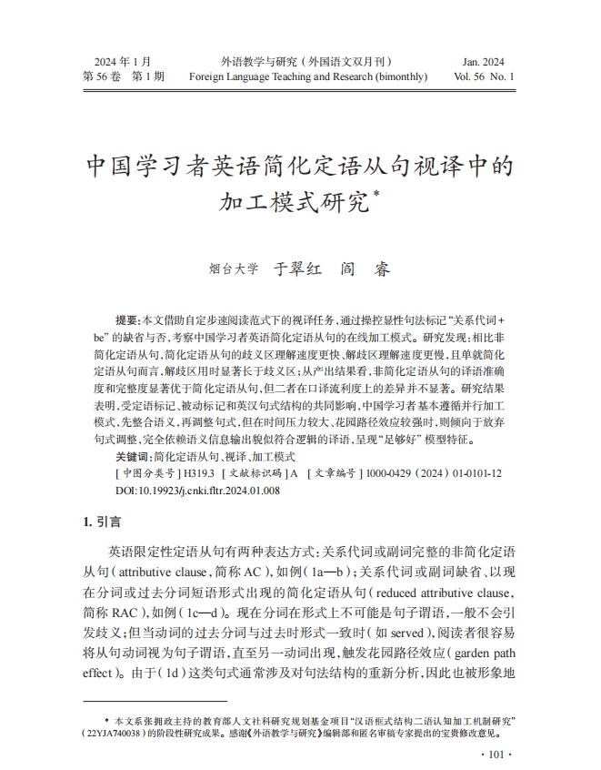 【本站訊】日前,煙臺大學外國語學院收獲喜訊,2021級外國語言文學專業研究生閻睿與導師于翠紅教授合作撰寫的論文《中國學習者英語簡化定語從句視譯中的加工模式研究》在外語類頂級期刊《外語教學與研究》2024年第1期發表。