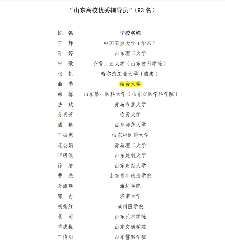 【本站訊】近日,山東省教育廳(省委教育工委)公布了2023年度“山東高校輔導員年度人物”宣傳選樹活動評選結果,煙臺大學特里爾可持續發展技術學院輔導員曲季榮獲“山東高校優秀輔導員”榮譽稱號。