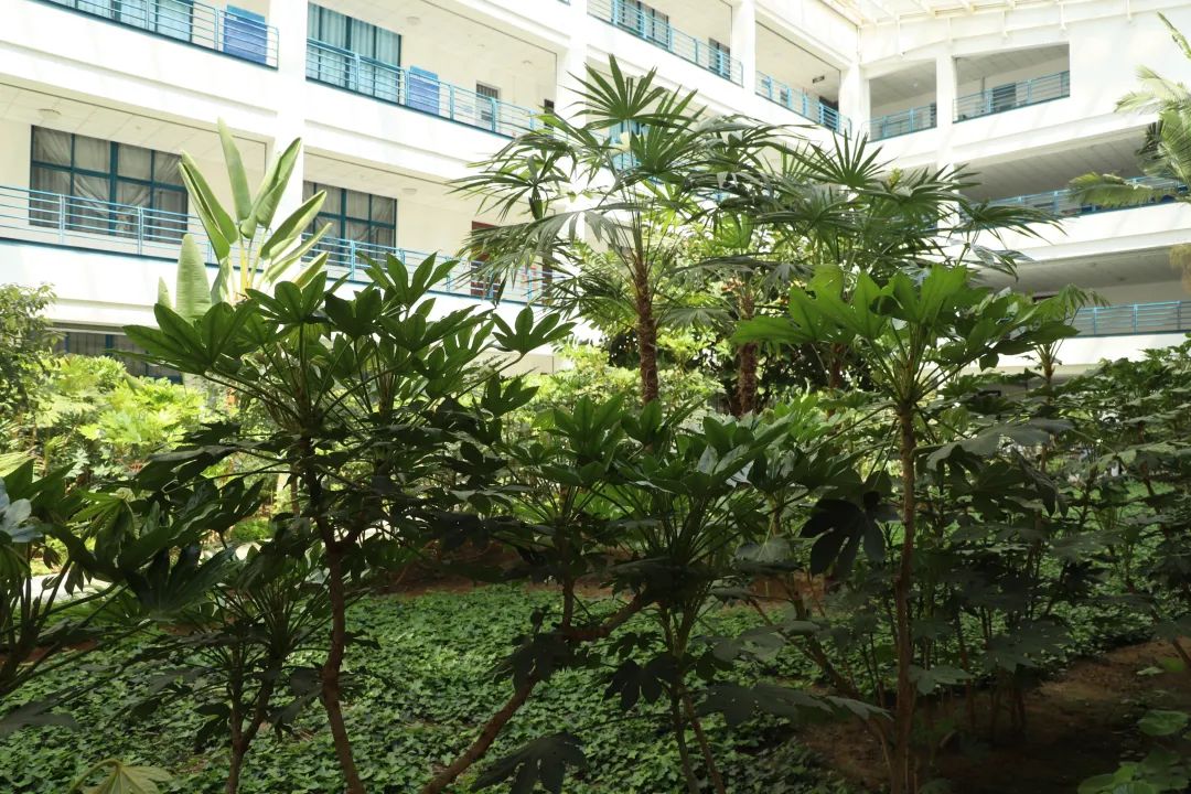 三分栽,七分養(yǎng)。養(yǎng)護工作對于綠化人來說是一項繁瑣的工作——澆水、施肥、修剪、除雜草、防治病蟲害等,每一件小事一年到頭,從未間斷。“剛來煙大工作的時候,這棵樹還沒有我半腰高?!睆埓骺粗矍耙呀涢L了10多米高的椰子樹不禁感慨道,“這里的一些植被和花種,是我從老家?guī)н^來的,看著它們從一棵棵小苗子一步步長大、開花、結果,給同學們的學習帶來更舒心的環(huán)境,內心覺得什么辛苦都值了?!鼻组L廊的“小植物園”時常會吸引到路過這里的師生?!懊看蝸砬组L廊上課,都會被這些花草所吸引,它們生機勃勃的樣子總會感染到我,讓我做事情更有動力?!蔽膶W與新聞傳播學院的夏孟吉說道。