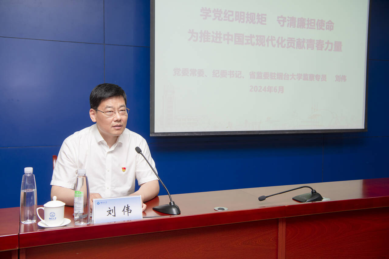 【本站訊】“青年黨員是黨和國家事業(yè)的接班人,能否做到嚴守紀法規(guī)矩、清正廉潔,不僅關(guān)系到自身健康成長,也關(guān)系到黨和國家事業(yè)的未來。在座的大家是青年中的佼佼者,一定要自覺學紀知紀明紀守紀,做到知敬畏、存戒懼、守底線,把遵規(guī)守紀刻印在心,內(nèi)化為言行準則,這樣才能行穩(wěn)致遠走好人生路……”黨紀學習教育正在開展,根據(jù)學校畢業(yè)生工作安排,6月5日下午,黨委常委、紀委書記、山東省監(jiān)察委員會駐煙臺大學監(jiān)察專員劉偉以“學黨紀明規(guī)矩,守清廉擔使命,為推進中國式現(xiàn)代化貢獻青春力量”為題,為2024屆畢業(yè)生黨員代表講授“青廉課堂”暨黨紀學習教育專題黨課。