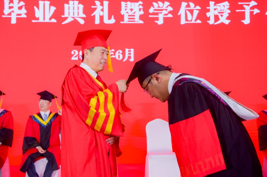 學位授予儀式上,校長、校學位評定委員會主席郝曙光為畢業生博士研究生、碩士研究生逐一頒發學位證書,撥穗正冠,握手祝福并合影留念。