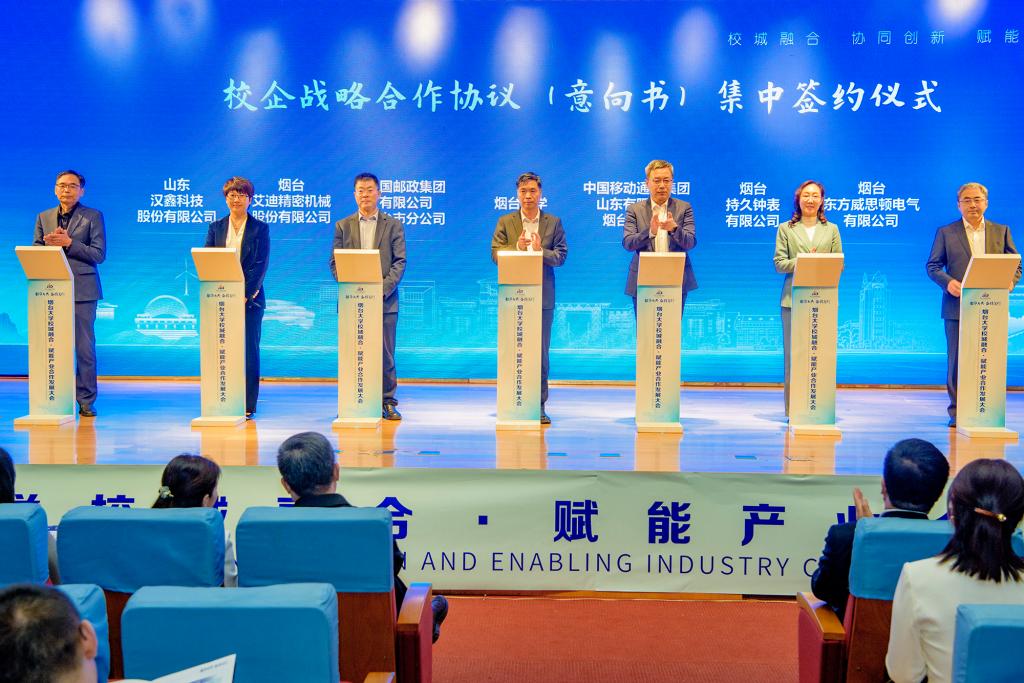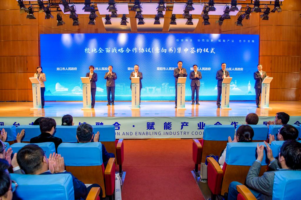 王麗代表學校與福山區、萊山區、萊陽市、棲霞市、龍口市簽訂全面戰略合作協議,張獻勇代表學校與12家企業簽訂戰略合作協議。會議還進行了9個科技成果轉化項目、2個科技合作平臺以及9個產教融合服務平臺的簽約和揭牌。
