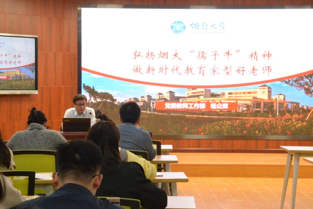 開班儀式結束后,楊眾暉為參訓教師作了題為《弘揚煙大“孺子牛”精神,做新時代教育家型好老師》的師德師風專題培訓。