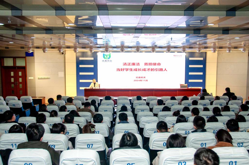 【本站訊】11月27日上午,學校舉行“廉潔自律強信念 牢記使命勇?lián)敗陛o導員“青廉課堂”暨廉政教育專題報告會,黨委常委、副校長姚昌,黨委常委、紀委書記、山東省監(jiān)察委員會駐煙臺大學監(jiān)察專員劉偉出席會議并講話。紀委副書記、綜合處處長王海麗以《清正廉潔、勇?lián)姑敽脤W生成長成才的引路人》為題,面向全體輔導員作廉政教育專題報告。黨委學工部相關負責人、全體輔導員參加學習。