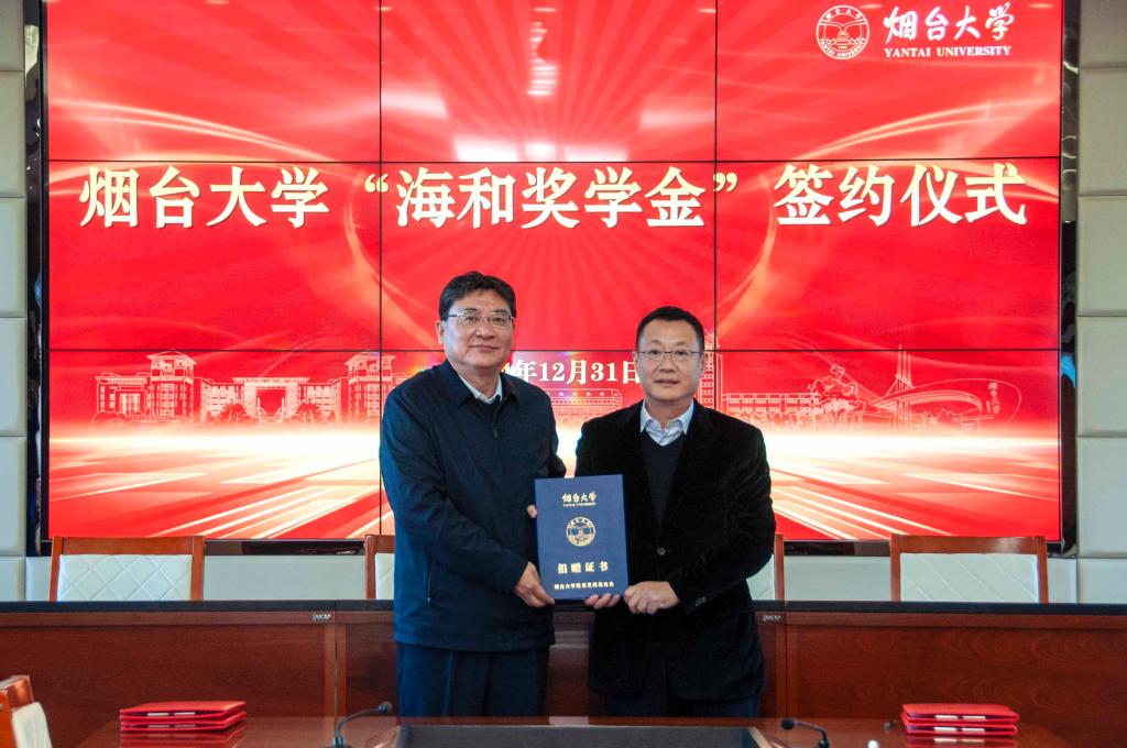 【本站訊】2024年12月31日下午,學校舉行“海和獎學金”簽約儀式,海和食品有限公司向我校捐贈40萬元設立海和獎學金,用于獎勵品學兼優學子,海和食品有限公司董事長、生命科學學院1985級校友王大軍,煙臺大學黨委副書記白青出席簽約儀式。合作發展處、教育發展基金會、黨委學生工作部(處)主要負責人,學院師生代表參加簽約儀式,簽約儀式由生命科學學院院長孫利芹主持。