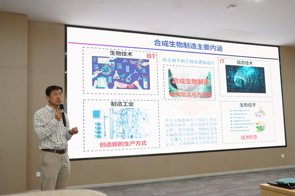李春教授以天然甘草酸挖根取酸的傳統獲取方式為切入點,介紹了課題組運用合成生物學技術解決甘草來源不足問題的多種方案,并詳細闡述了課題組從不同來源挖掘多個甘草三萜合成相關基因,實現多種稀有甘草三萜的微生物制造,并獲得多個新的三萜類天然產物。隨后,李春教授又進一步闡述了關于植物萜烯類和黃酮類化合物微生物細胞工廠的設計與構建,包括化合物合成相關途徑的解析與設計、微生物底盤細胞的設計與改造、多基因途徑的組裝、相關合成與細胞生長的協同調控、細胞工廠優化與適配、工藝開發與集成的研究等,還介紹了使用相關技術所實現的一系列結構新穎的三萜和黃酮類化合物的綠色高效生物制造等成果。李春教授的報告深入淺出,拓展了我校師生在合成生物學方面的科研視野,為未來我校開展合成生物學相關研究提供了很好的指導。