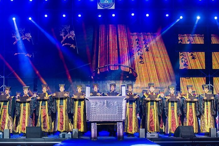 晚會(huì)在莊重肅穆的成人禮中拉開帷幕。新生代表身著漢服,手持書卷,長(zhǎng)袍廣袖,古意盎然。“成人之者,將責(zé)成人禮焉也。責(zé)成人禮焉者,將責(zé)為人子、為人弟、為人臣、為人少者之禮行焉…… ”他們向老師、家長(zhǎng)莊嚴(yán)宣告:我已長(zhǎng)大成人!并將承擔(dān)起家庭、社會(huì)責(zé)任,不辱祖先,無愧我名;復(fù)興中華,光耀汗青!我校每年都在迎新晚會(huì)上舉辦成人禮,旨在引導(dǎo)大學(xué)生了解中華傳統(tǒng)文化,銘記責(zé)任,踐行社會(huì)主義核心價(jià)值觀,為中華民族偉大復(fù)興貢獻(xiàn)力量。