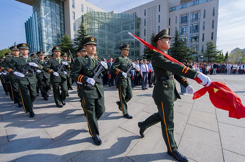 上午9時,鏗鏘有力的腳步聲在廣場上響起,在場師生屏氣凝神把目光投向國旗護衛隊走來的方向。由30名在校生組成的國旗護衛隊挺拔威武,邁著整齊的步伐,護衛國旗走向升旗臺。伴隨著威武雄壯的《義勇軍進行曲》,鮮紅的五星紅旗冉冉升起,在場師生齊唱國歌,肅立行注目禮,共同感受這一莊重而自豪的時刻。