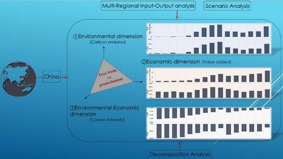 研究團(tuán)隊(duì)基于投入產(chǎn)出分析和情景分析模型,提出一種新穎的評(píng)價(jià)框架量化貿(mào)易活動(dòng)的影響。研究選取了“環(huán)境”、“經(jīng)濟(jì)”、“環(huán)境-經(jīng)濟(jì)”三維研究視角,從總量到行業(yè)分量層面分別探討了貿(mào)易的絕對(duì)影響和相對(duì)影響。結(jié)果表明,中國作為貿(mào)易活動(dòng)主要參與者,其在“環(huán)境”維度的污染天堂假說和“經(jīng)濟(jì)”維度的貿(mào)易推動(dòng)經(jīng)濟(jì)發(fā)展的觀點(diǎn)得到數(shù)據(jù)檢驗(yàn),在“環(huán)境-經(jīng)濟(jì)”維度的量化影響指出貿(mào)易活動(dòng)降低了碳排放強(qiáng)度。此外,本研究還探討了量化貿(mào)易影響的部門異質(zhì)性、并分解分析了總量和結(jié)構(gòu)效應(yīng)的驅(qū)動(dòng)因素。本研究致力于為國家可持續(xù)發(fā)展政策制定提供數(shù)據(jù)支撐,通過合理調(diào)節(jié)貿(mào)易的影響、推動(dòng)實(shí)現(xiàn)貿(mào)易中獲得更多的環(huán)境經(jīng)濟(jì)收益和避免環(huán)境損失。
