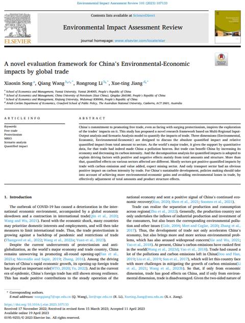 近日,煙臺(tái)大學(xué)經(jīng)濟(jì)管理學(xué)院宋曉欣博士在國際環(huán)境科學(xué)類別期刊《Environmental Impact Assessment Review》(中科院一區(qū)TOP,IF:7.9)上發(fā)表題為“A novel evaluation framework for China’s Environmental-Economic impacts by global trade”的高水平論文,宋曉欣博士為本文的第一作者,煙臺(tái)大學(xué)經(jīng)濟(jì)管理學(xué)院作為本文第一單位。