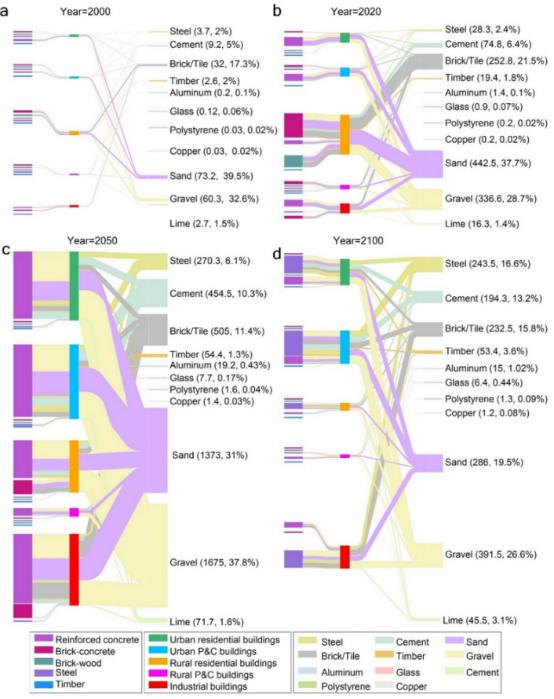 論文構建了CDW評估模型,系統分析了中國建筑建造與拆除廢棄物的來源、分布及構成。結果顯示,2000年至2100年,中國將產生2240.8億噸CDW,主要為碎石(34.15%)、砂子(30.08%)和磚瓦(14.37%)。在此期間,CDW來源將從農村住宅逐漸轉向城鎮公共和商業建筑。在建筑拆除階段采用材料回收策略的減排效果最佳,到2100年可累積減少1512.5億噸的CDW。研究為中國CDW治理和資源化利用提供了科學依據,有助于制定更加可持續的廢棄物管理策略。